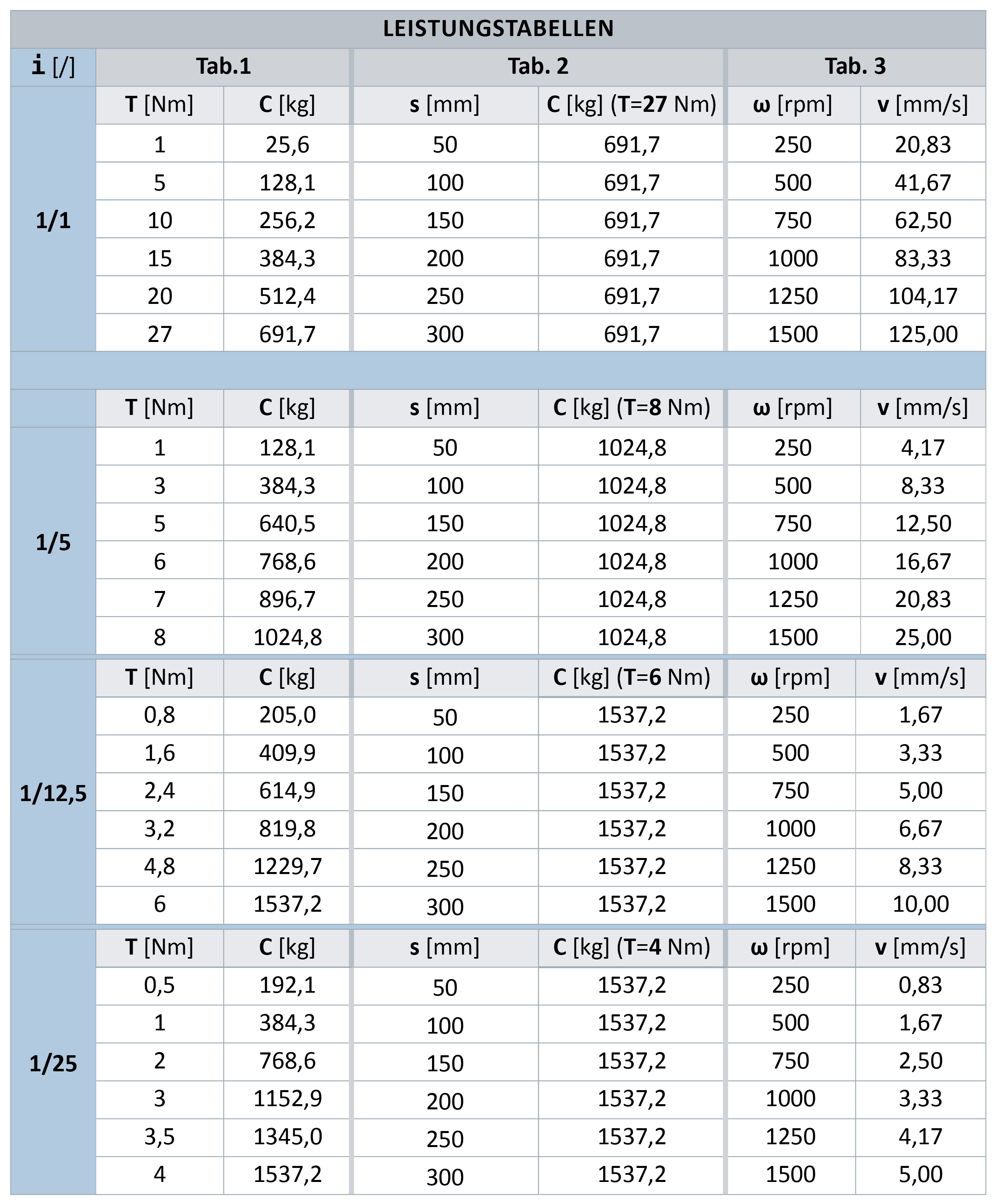 • Axialbelastung auf Eingangswelle: 200 kg• Standardhübe: 100 – 1000 mm