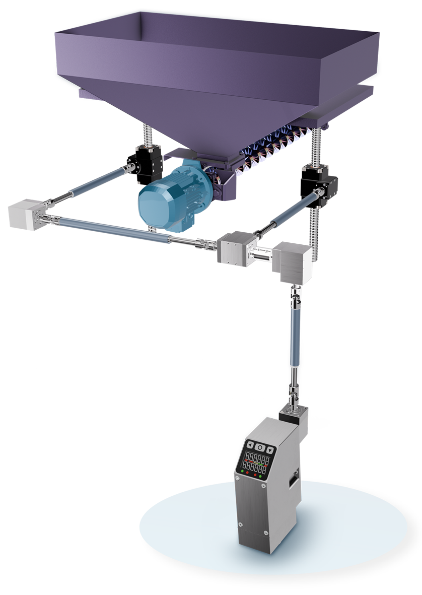 Synchronized and stable positioning of moving guides Controlled dosing for hopper