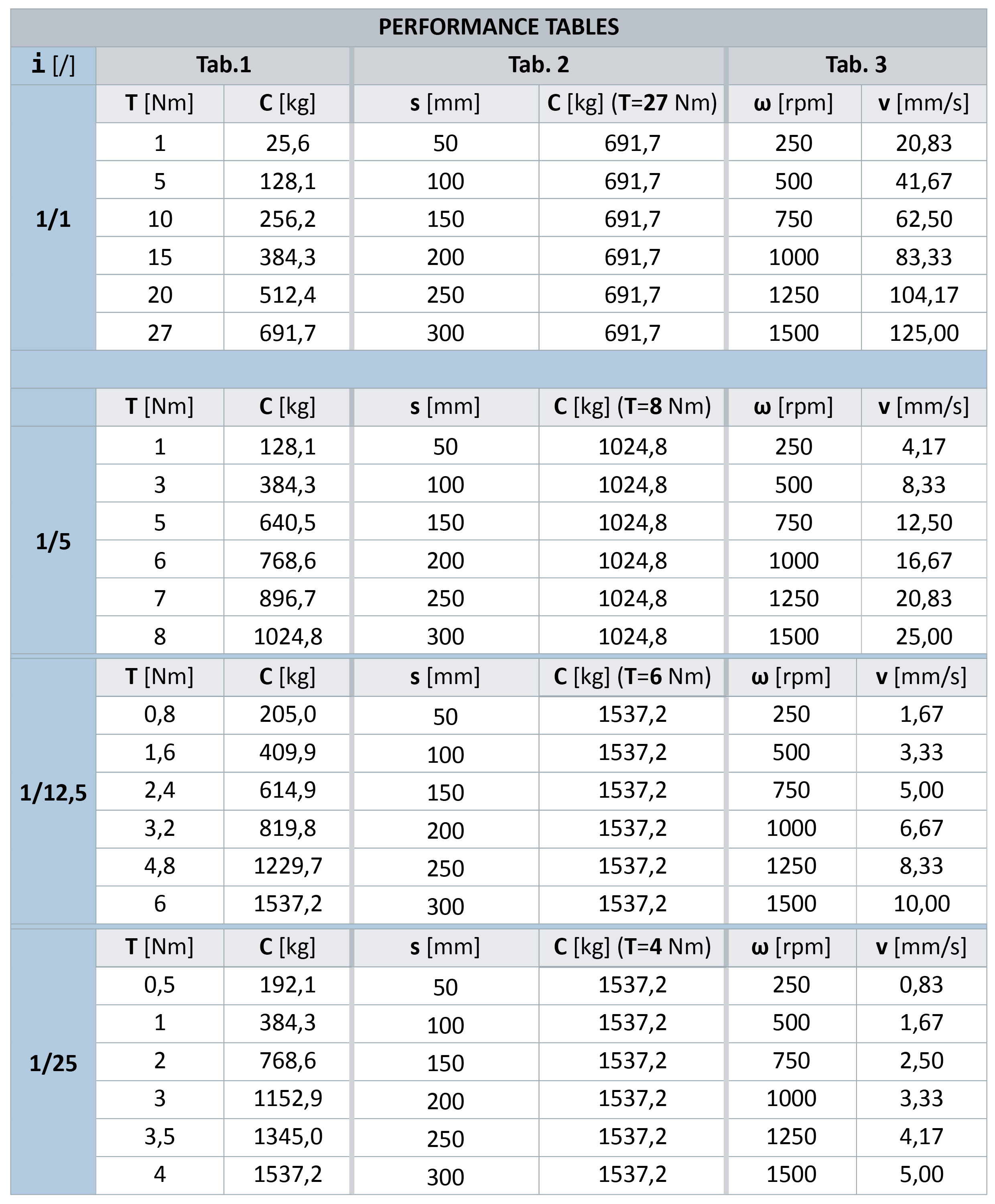 ⦿ All tables show linear measurements expressed in <mm>, unless otherwise specified. All the reduction ratios are expressed as a <fraction> unless otherwise specified. All forces are expressed in N, loads in kg, torques in Nm, and efficiencies in %, unless otherwise specified. |