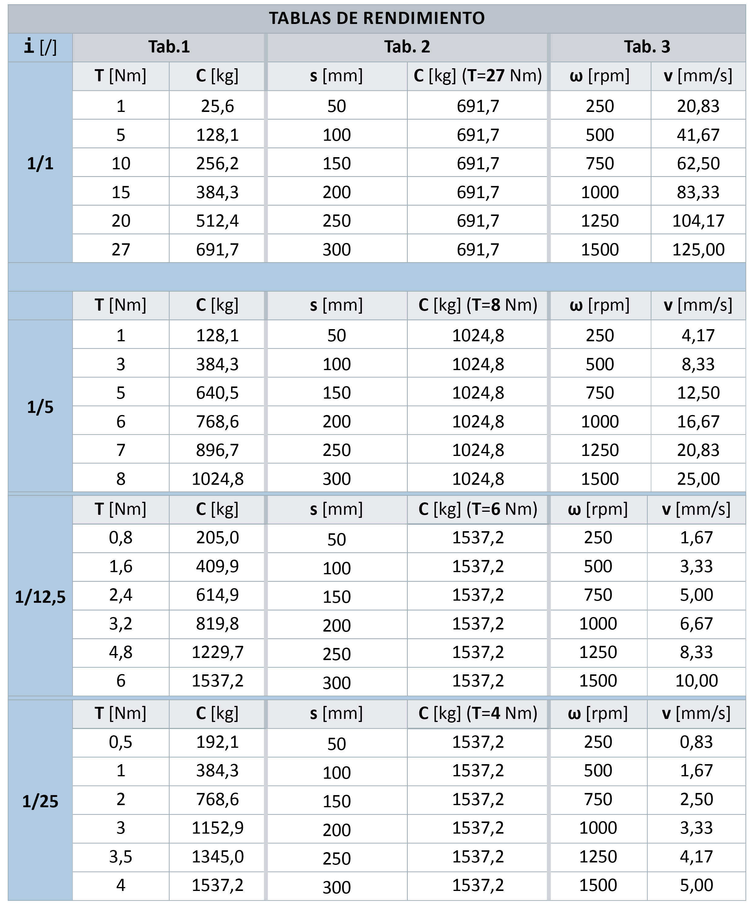 ⦿ Para la identificación del reenvío/reductor mas apropiado a las propias necesidades, comprobar los valores escritos en la tabla para cada modelo, en el caso las cargas y los rendimientos reales sean muy cerca de los valores de la tabla contactar el departamento técnico. |