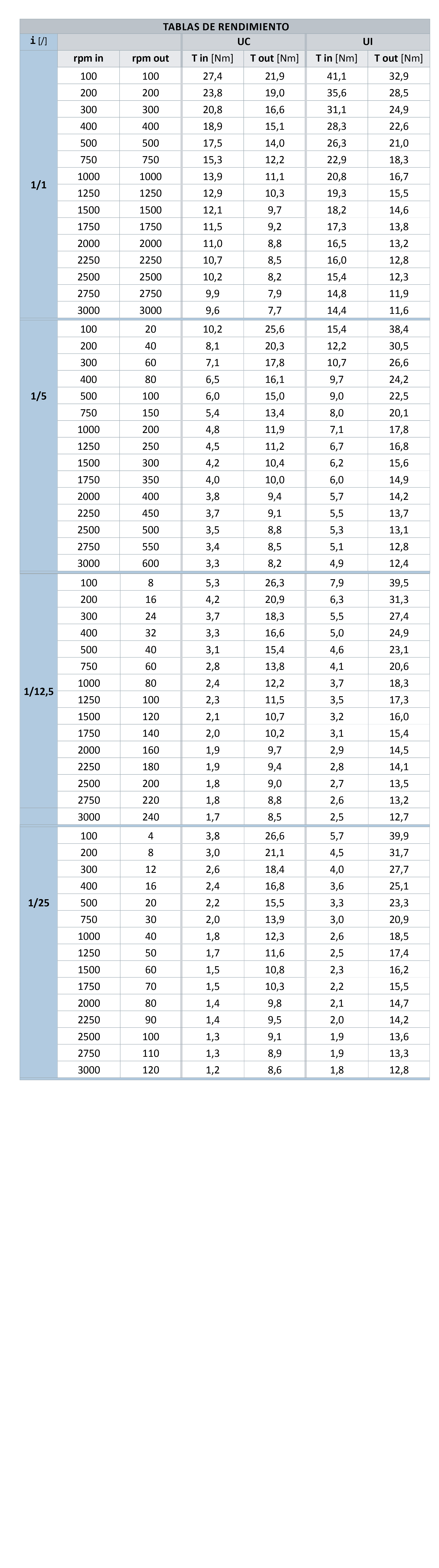 • Lubricación por baño de aceite para velocidades de entrada > 200 rpm; con grasa para velocidades < 200 rpm