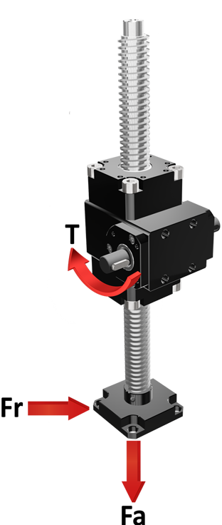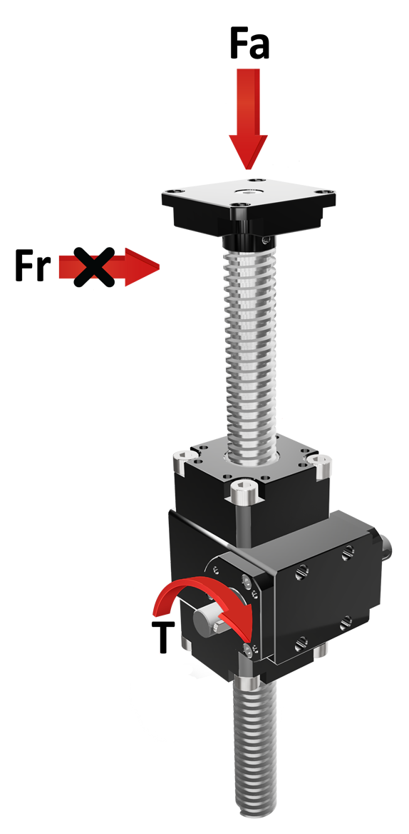 | L’installazione deve essere eseguita in modo da evitare carichi radiali o laterali sulla vite trapezia, principale causa di guasti. | L’asta filettata e il piano di fissaggio del riduttore devono essere ortogonali; è necessario verificare l’assialità tra il carico e l’asta, evitando qualsiasi eccentricità. |
